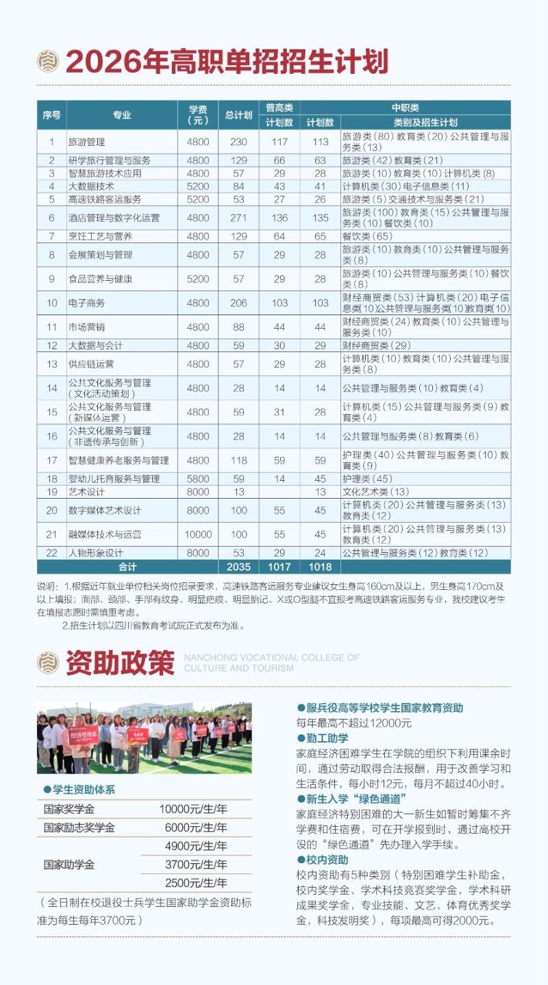 南充文化旅游职业学院2026年高等职业教育单独考试招生简章